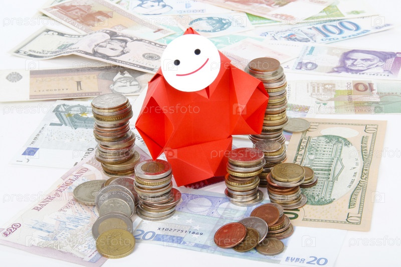 Символическое изображение денег, достатка, сбережений и материального благополучия. Люди-оригами и денежные знаки (монеты и купюры)