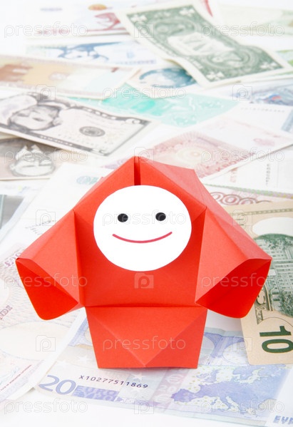Символическое изображение денег, достатка, сбережений и материального благополучия. Люди-оригами и денежные знаки (монеты и купюры)
