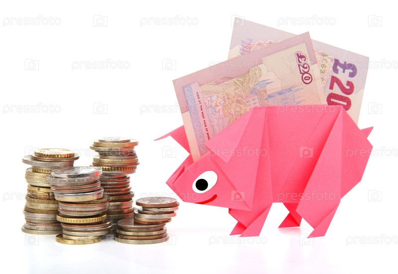 Символическое изображение денег, достатка, сбережений и материального благополучия. Свинка-оригами и денежные знаки (монеты и купюры)