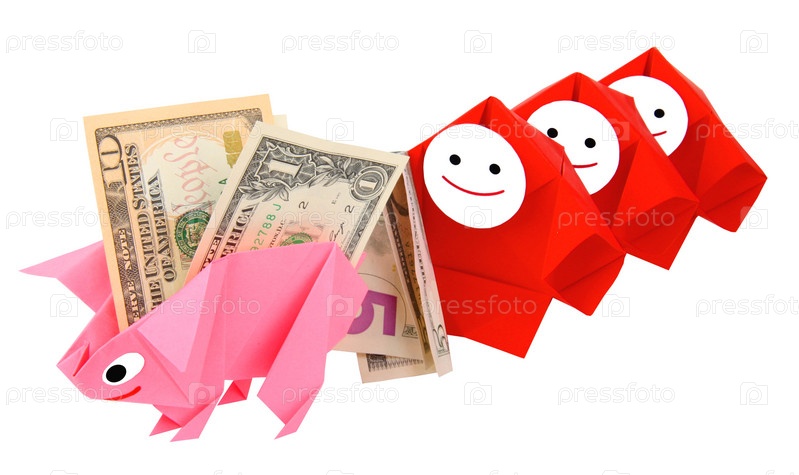 Символическое изображение денег, достатка, сбережений и материального благополучия. Свинка-оригами и денежные знаки (монеты и купюры)