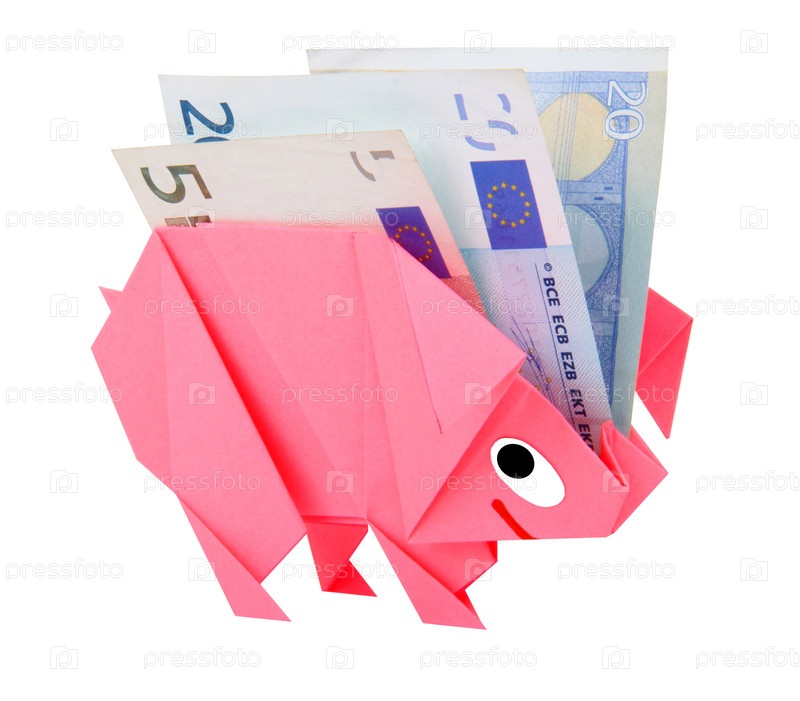Символическое изображение денег, достатка, сбережений и материального благополучия. Свинка-оригами и денежные знаки (купюры)