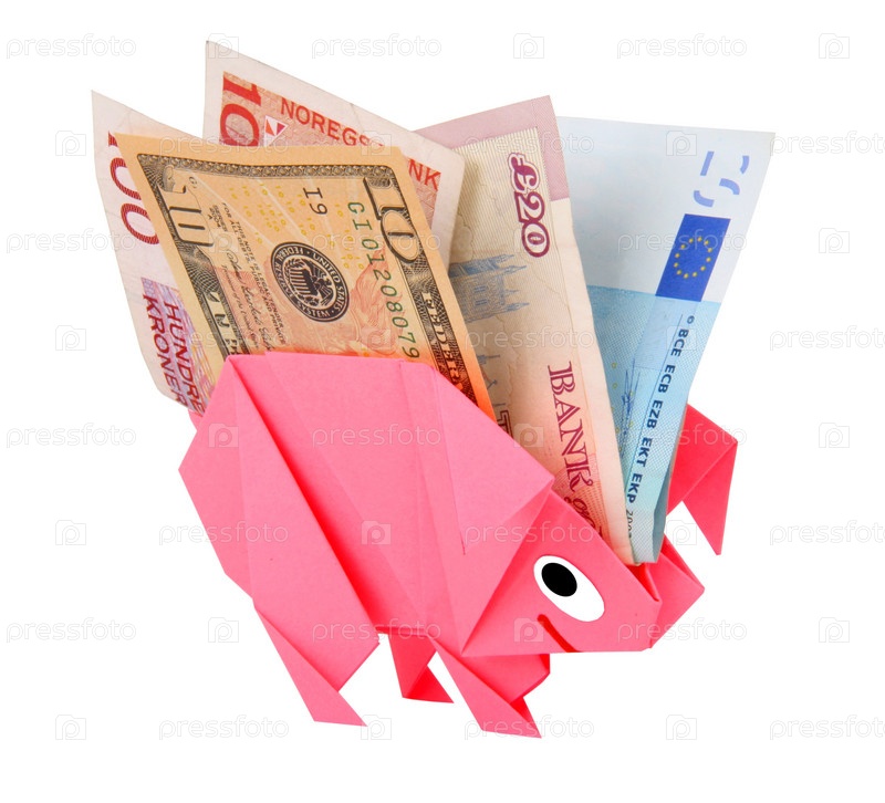 Символическое изображение денег, достатка, сбережений и материального благополучия. Свинка-оригами и денежные знаки (купюры)