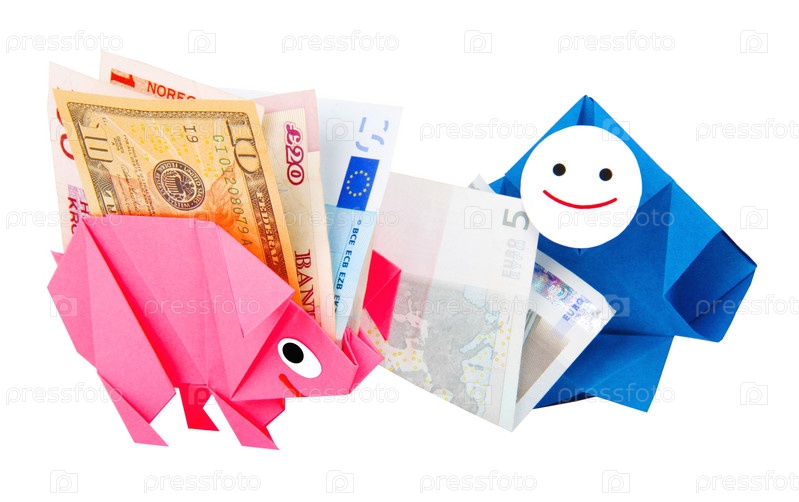 Символическое изображение денег, достатка, сбережений и материального благополучия. Свинка-оригами и денежные знаки (купюры)