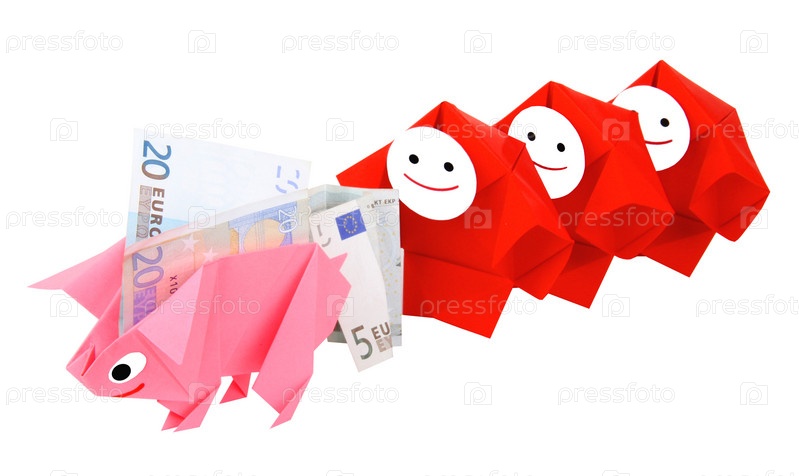 Символическое изображение денег, достатка, сбережений и материального благополучия. Свинка-оригами и денежные знаки (купюры)