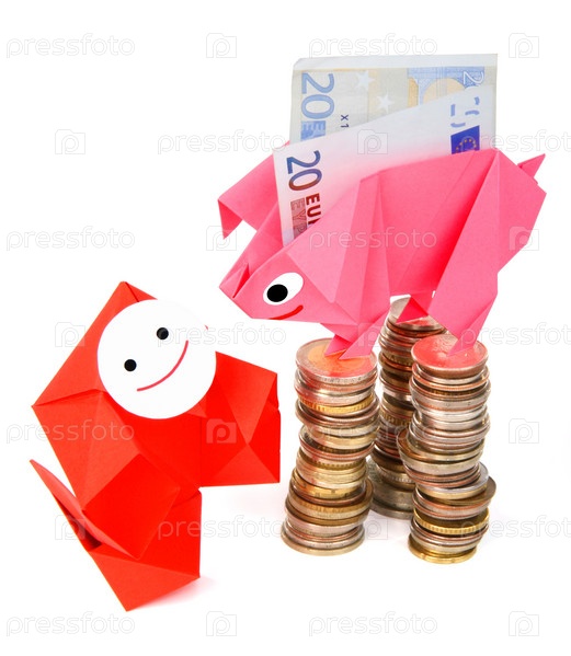 Символическое изображение денег, достатка, сбережений и материального благополучия. Свинка-оригами и денежные знаки (монеты и купюры)