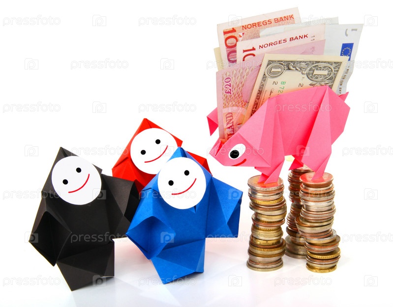 Символическое изображение денег, достатка, сбережений и материального благополучия. Свинка-оригами и денежные знаки (монеты и купюры)