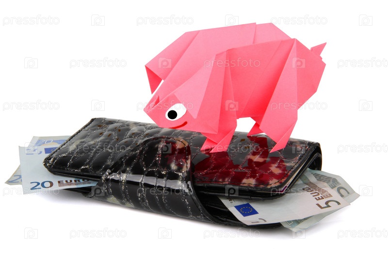 Символическое изображение денег, достатка, сбережений и материального благополучия. Свинка-оригами и денежные знаки (купюры)