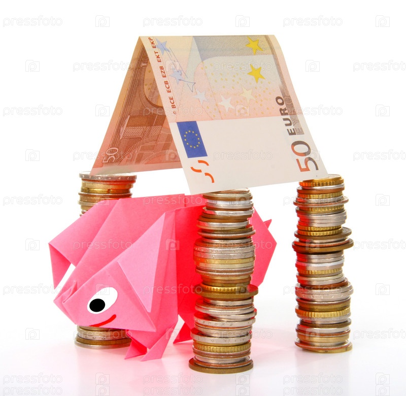 Символическое изображение денег, достатка, сбережений и материального благополучия. Свинка-оригами и денежные знаки (монеты и купюры)
