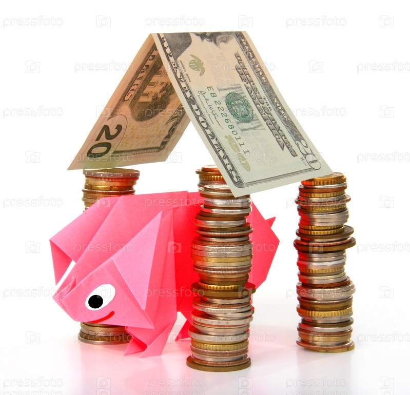 Символическое изображение денег, достатка, сбережений и материального благополучия. Свинка-оригами и денежные знаки (монеты и купюры)