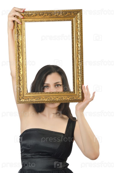 Женщина с фоторамкой на белом фоне