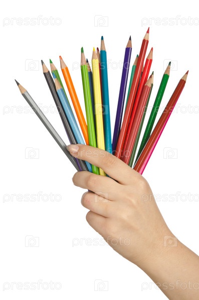 Рука держит цветные карандаши на белом фоне