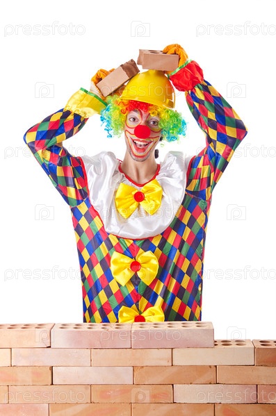Концепция плохого строительства с клоуном, кладущим кирпич