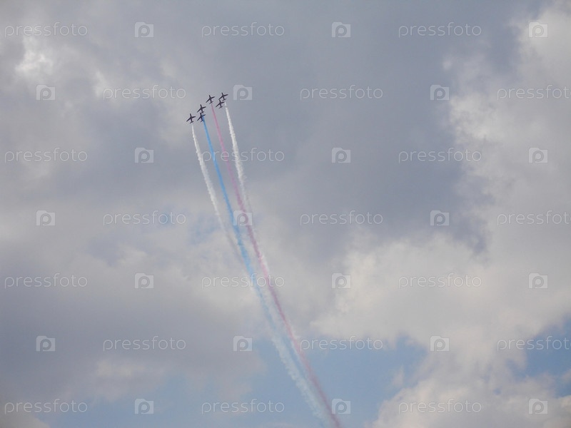 Британская команда Красные стрелы на военных истребителях Hawk T1 с дымом в небе.Россия, город Жуковский, 12 августа 2012 года