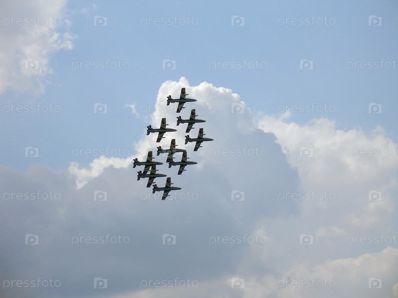 Итальянская группа Фрече триколори на военных истребителях MB-339 в небе.Россия, город Жуковский, 12 августа 2012 года
