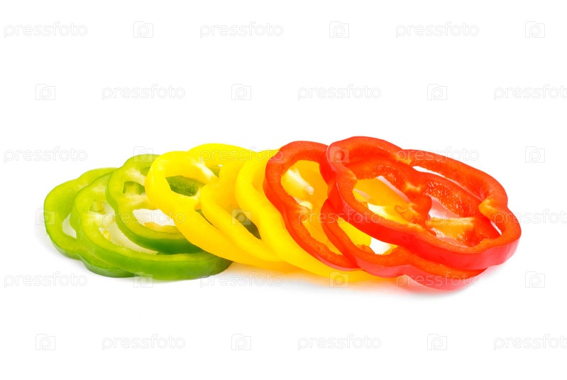 Красный, зеленый и желтый нарезанный перец, изолированный на белом фоне