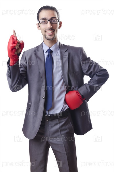 Бизнесмен в боксерских перчатках на белом фоне