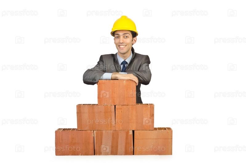 Бизнесмен с кирпичами на белом фоне