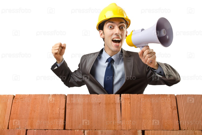 Бизнесмен с кирпичами на белом фоне