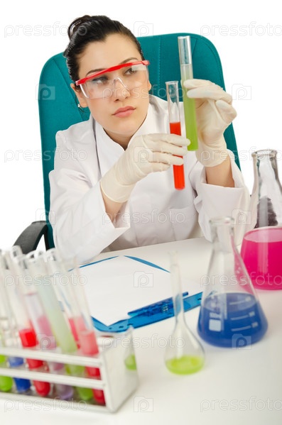 Женщина-химик в студии на белом фоне