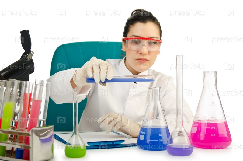 Женщина-химик в студии на белом фоне