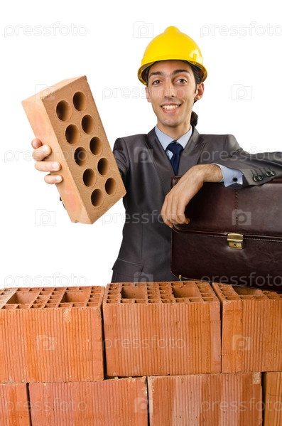 Бизнесмен у кирпичной стены на белом фоне