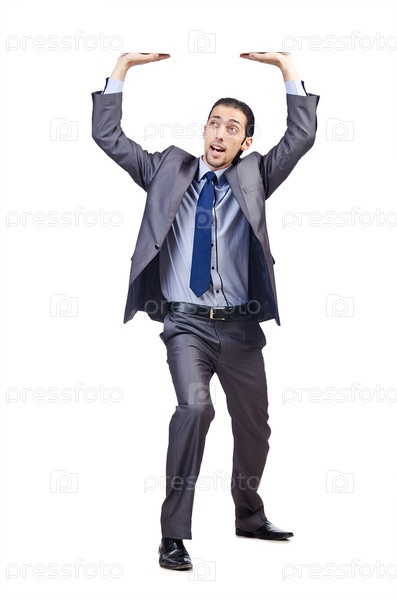 Молодой предприниматель толкет невидимое препятствие