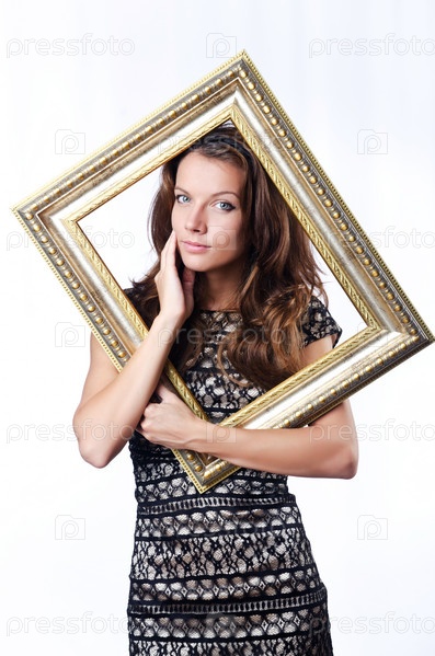Женщина с фоторамкой на белом фоне