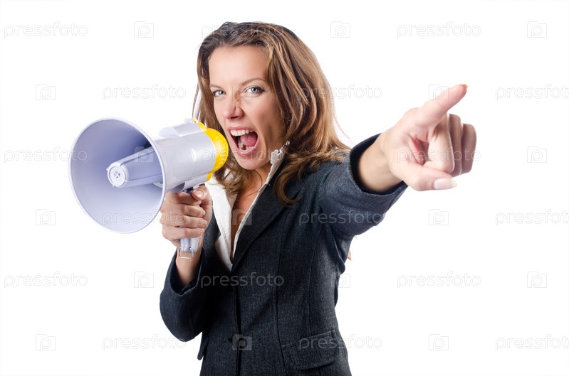 Деловая женщина с громкоговорителем на белом фоне