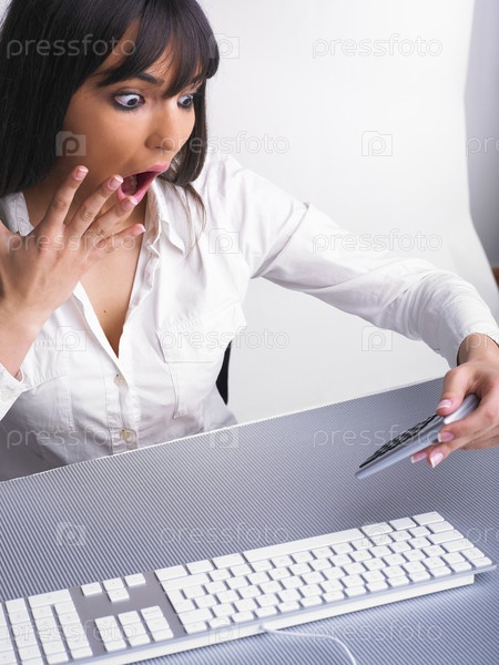 Удивленная деловая женщина анализирует данные и планирует