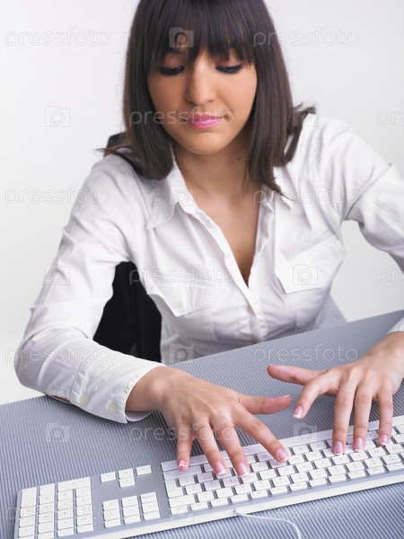 Бизнес-леди печатает на клавиатуре компьютера