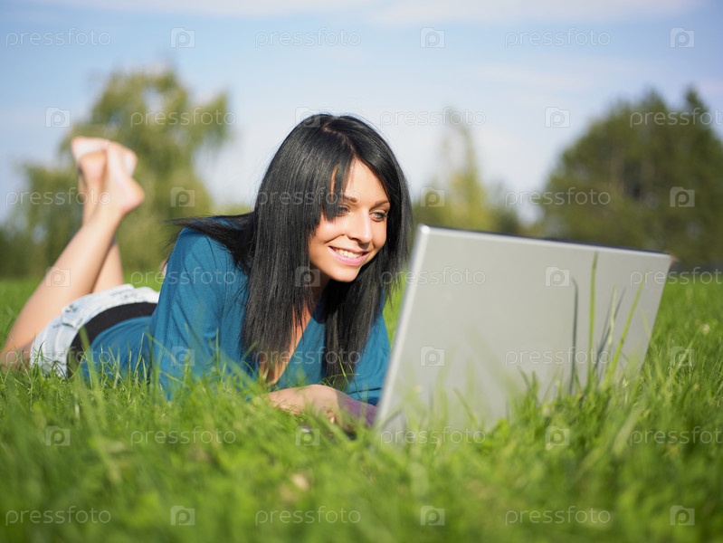Молодая женщина с ноутбуком в парке