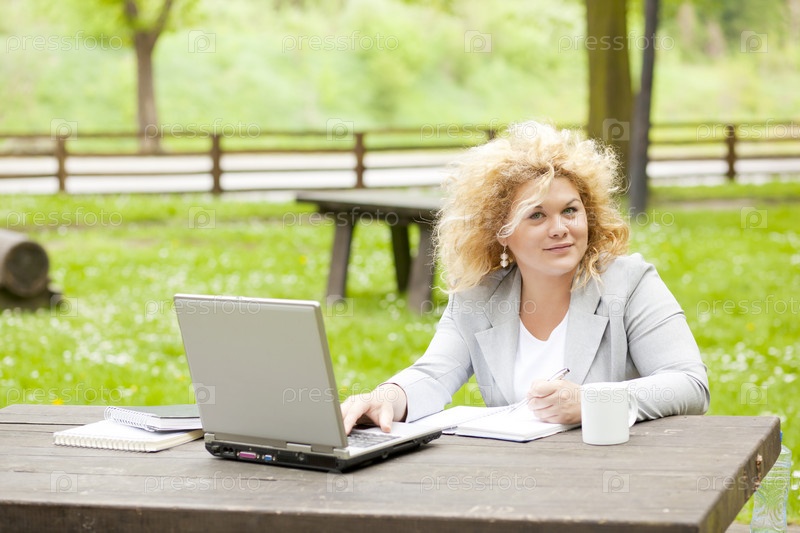 Деловая женщина с ноутбуком в парке