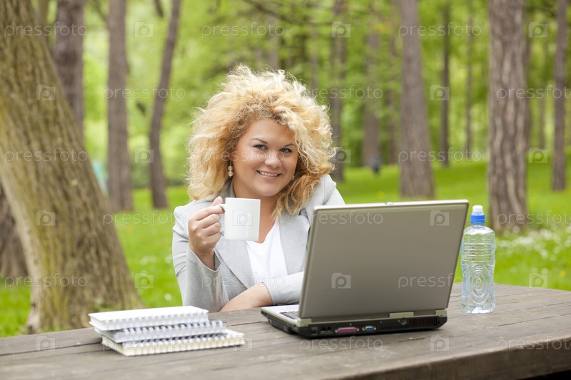 Женщина использует ноутбук в парке