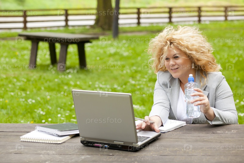 Женщина использует ноутбук в парке