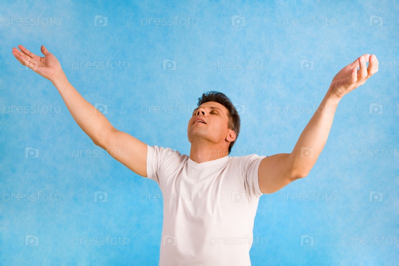 Портрет красивого мужчины, поднимающего руки в восторге над голубым фоном