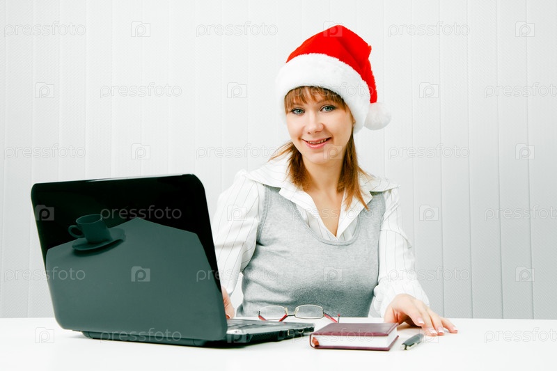 Девушка в новогодней шапке с ноутбуком