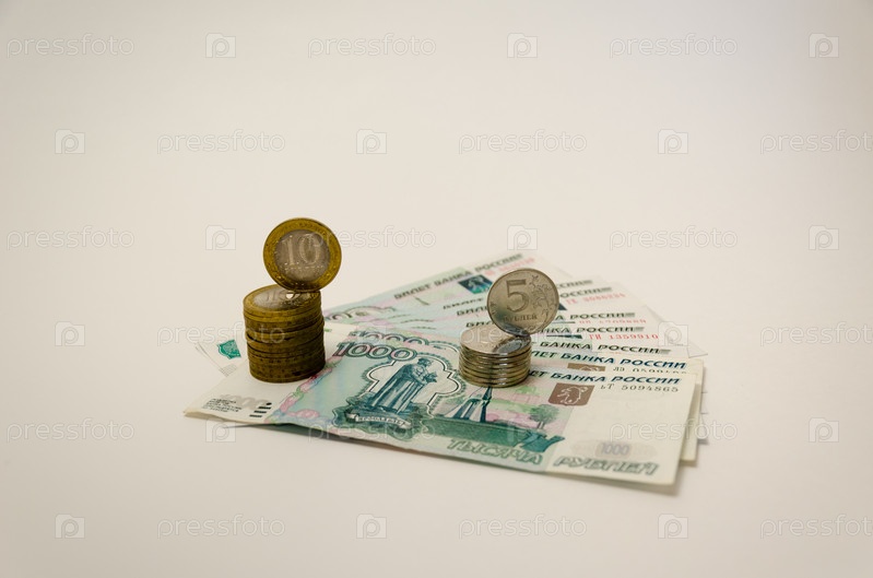 Стопки металлических монет на банкнотах