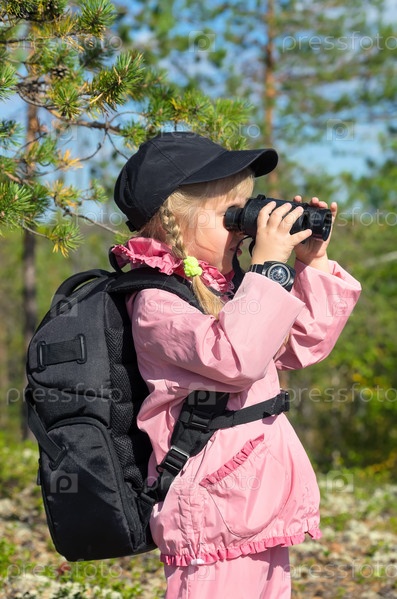 Девочка в лесу смотрит в бинокль