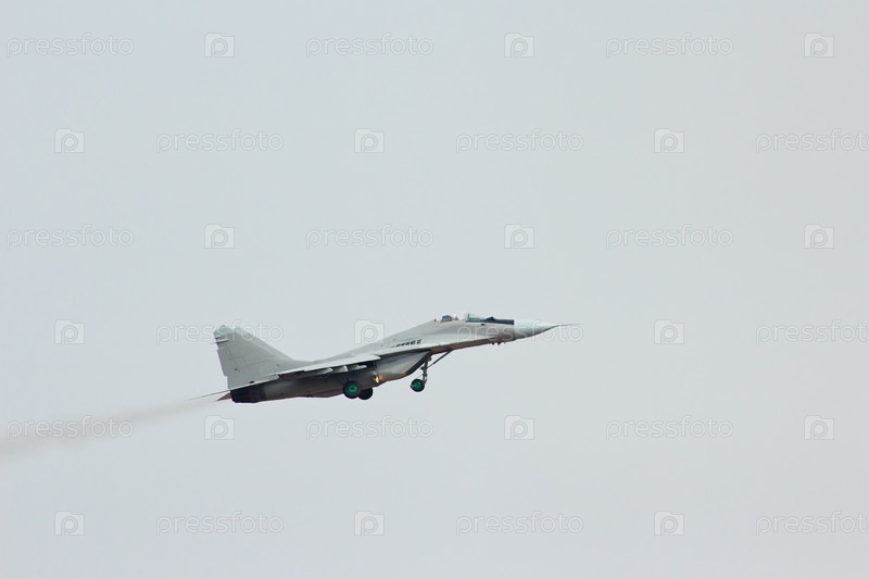 Полет тактического истребителя МиГ-29 в облачном небе