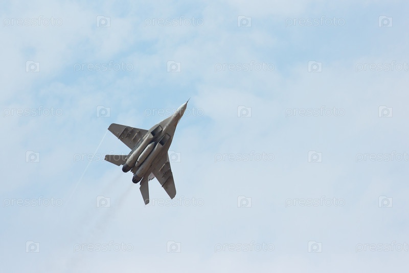 Полет тактического истребителя МиГ-29 в облачном небе