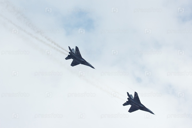 Два российских военных истребителя МиГ-29 в небе