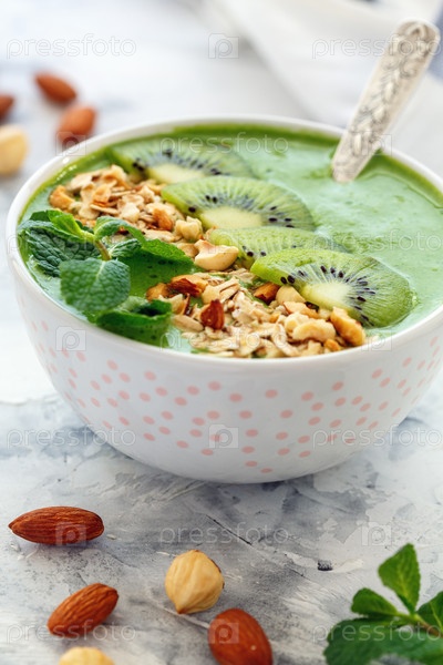 Чаша со шпинатом, мюсли, киви и орехами