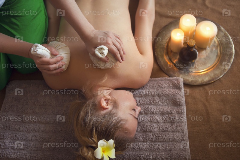 Женщина получает тайский травяной компресс в спа