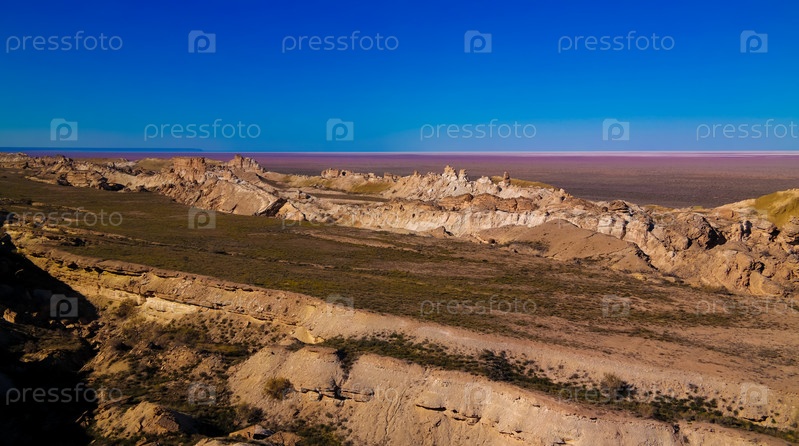 Аральское море от края плато Устюрта на закате в Каракалпакстане, Узбекистан