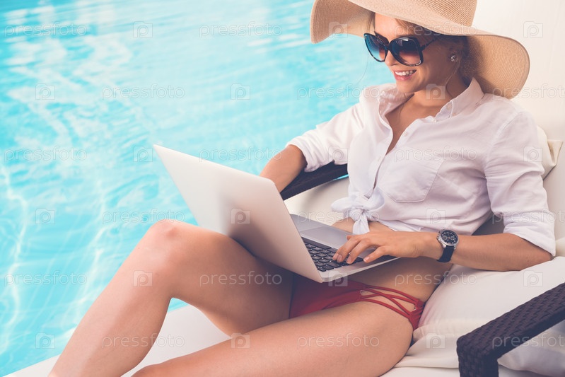 Девушка с ноутбуком у бассейна