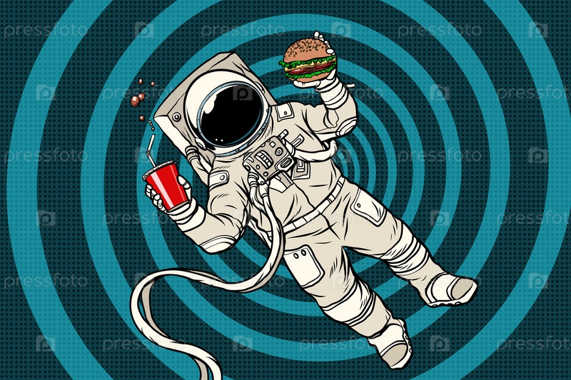 Космонавт в невесомости с фаст-фудом