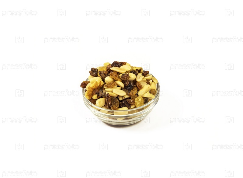 Смесь орехов, изюма и цукатов в стеклянной салатнице