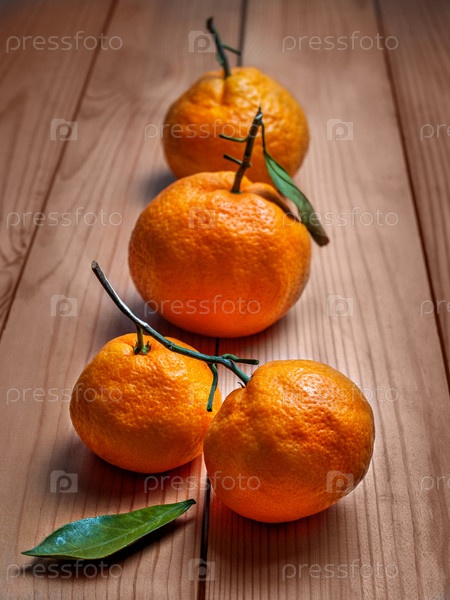 Мандарины с веточками и листьями на деревянном фоне