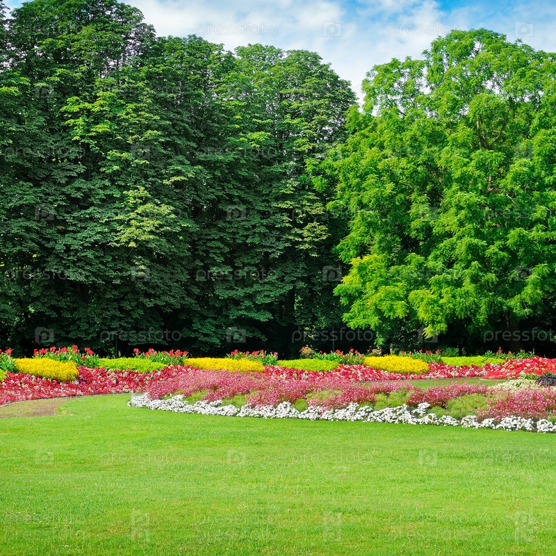 Летний парк с красивыми клумбами