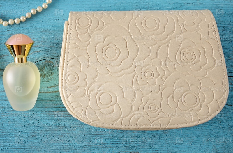 Сумочка и бутылка духов на синем фоне
